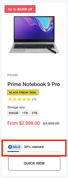 If the Flash sale inventory threshold is set to 10, and the product currently has a total of 5 units in stock (across all variants), the progress bar will display 50% claimed.